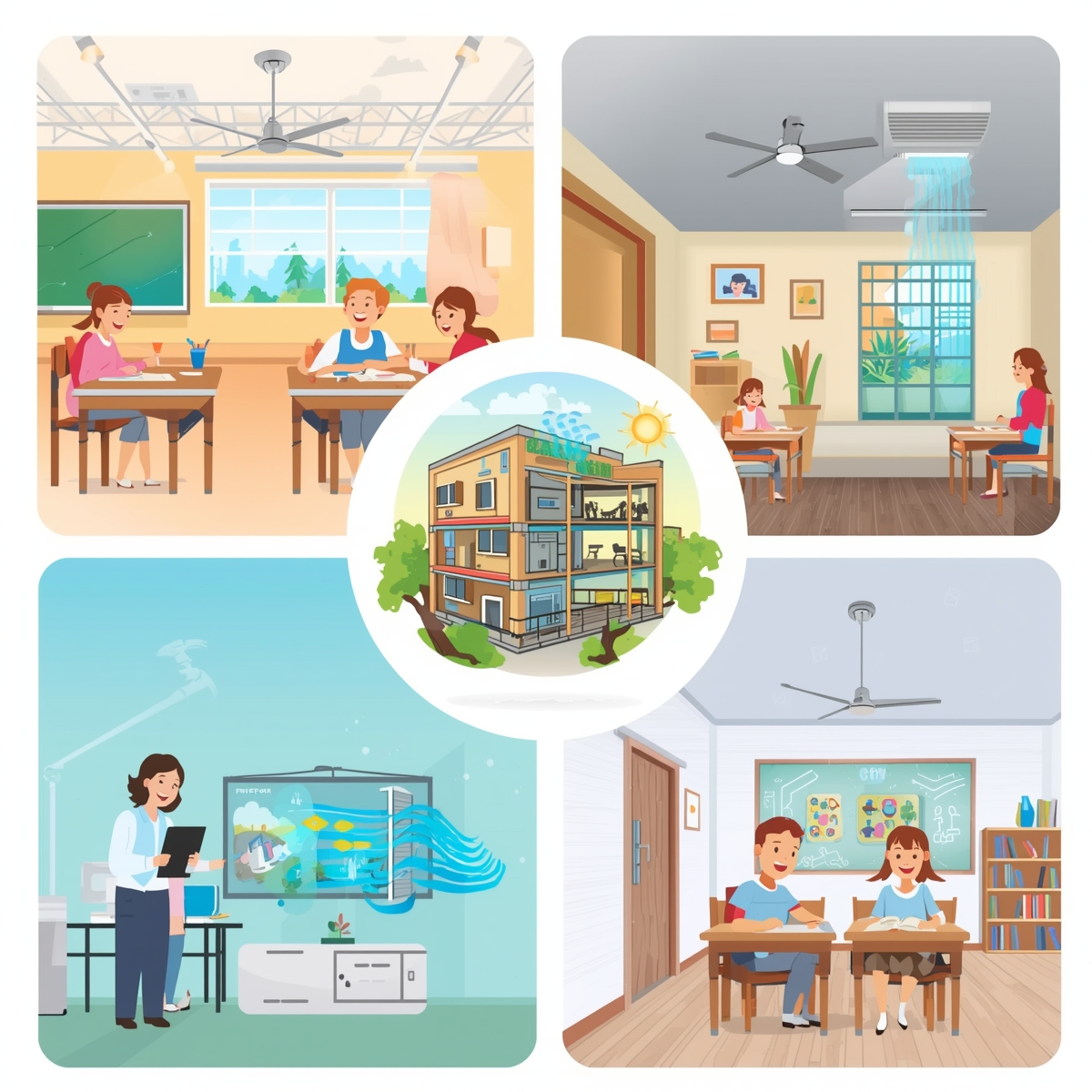 • افزایش دی‌اکسید کربن (CO₂): تنفس تعداد زیادی کودک و مربی در یک فضای بسته، سطح CO₂ را به‌سرعت بالا می‌برد که نتیجه آن خواب‌آلودگی، کاهش تمرکز و بی‌حالی کودکان است. برای کاهش سطح CO₂ و تأمین هوای تازه در سالن‌های بزرگ، استفاده از سیستم تهویه مرکزی با فن سانتریفیوژ قدرتمند گزینه‌ای مؤثر و کم‌صدا محسوب می‌شود.