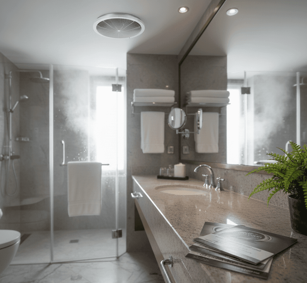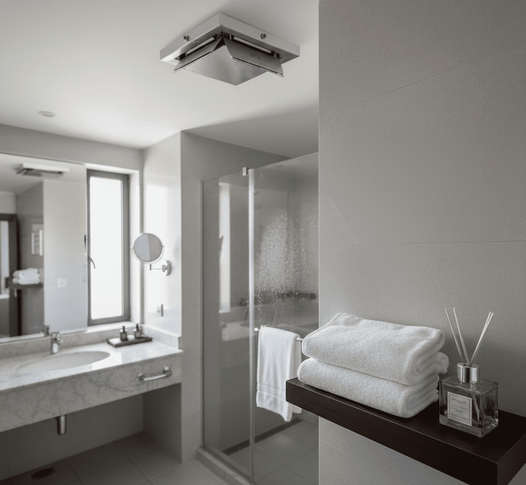 رطوبت ناشی از استحمام مسافران، اگر سریعاً تخلیه نشود، باعث ایجاد کپکهای سیاه در درز کاشیها و سقف میشود. اگزاست فنهای سنسوردار میتوانند به محض افزایش رطوبت فعال شده و از آسیب به دکوراسیون گرانقیمت اتاقها جلوگیری کنند.
